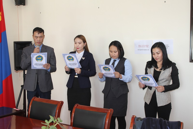 2019-11-26 00:00:00 | 358Монгол Улсын Төрийн албаны тухай хуулийн 36 дугаар зүйл 36.1, Монгол Улсын Ерөнхийлөгчийн 1995 оны 19 дүгээр зарлигаар батлагдсан “Төрийн захиргааны албан хаагчийн тангараг өргөх ёслолын журам”-д заасны дагуу төрийн албаны шалгалтанд тэнцсэн иргэдийн “Төрийн захиргааны албан хаагчийн тангараг өргөх ёслолын үйл ажиллагаа” 2019 оны 11 сарын 25-ны өдөр Өмнөговь аймгийн Ханбогд сумын Засаг даргын тамгын газрын иргэний танхимд зохион байгуулагдлаа.