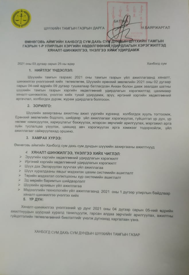 2021 оны 1-р улирлын байдлаар хэргийн хөдөлгөөний удирдлагад хяналт шинжилгээ, үнэлгээ хийсэн дүнг танилцуулав.